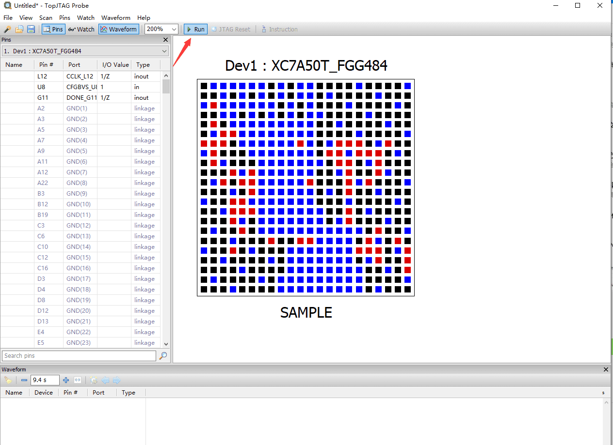 7-选择完成后,点击Run,就会显示FPGA各个IO现在的翻转状态了,你就一个一个去数吧,引脚 0 1翻转的时候会显示为红黑不同颜色