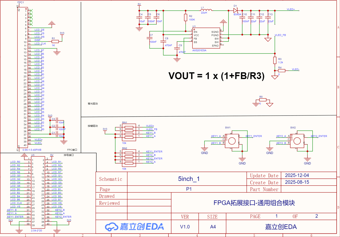 模块设计 :主要分为背光电路控制+数字信号输入。采用AX5201作为背光电源控制,连通数字信号输入接口,并按照黑金开发板接口的顺序排列,具体原理设计如下
